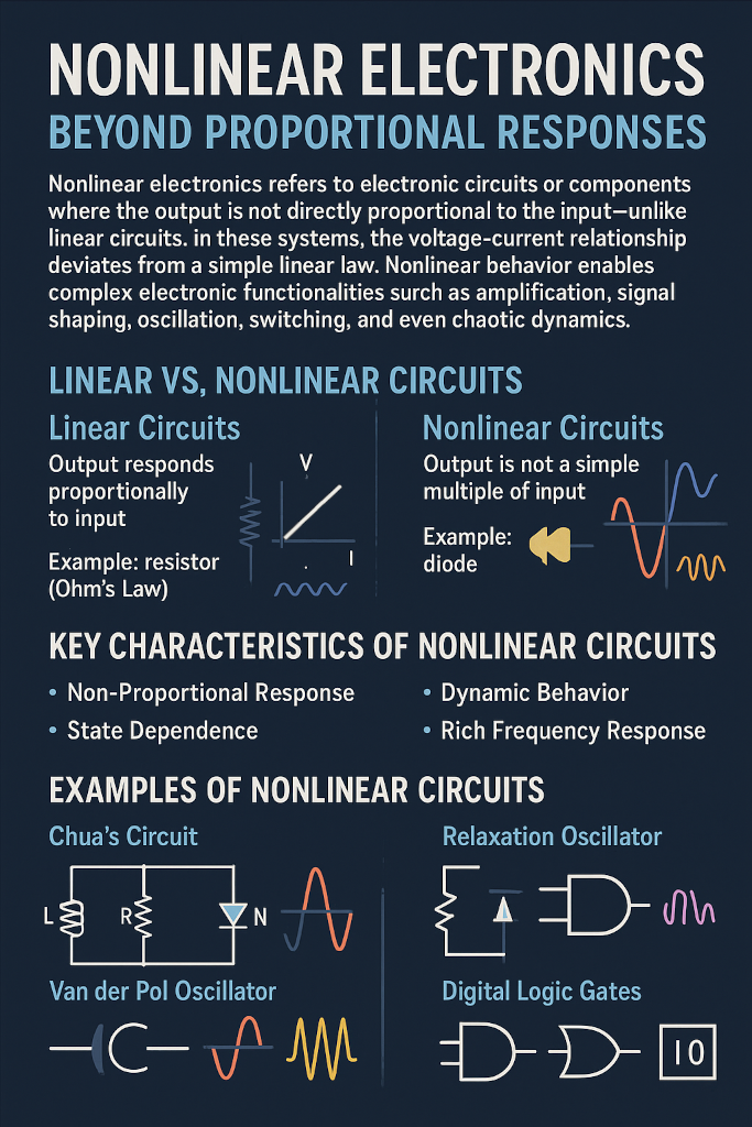Nonlinear electronics refers to electronic circuits or components where the output is not directly proportional to the input—unlike linear circuits. In these systems, the voltage-current relationship deviates from a simple linear law. Nonlinear behavior enables complex electronic functionalities such as amplification, signal shaping, oscillation, switching, and even chaotic dynamics.